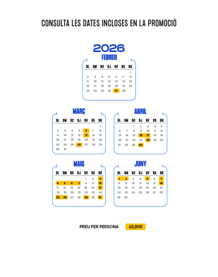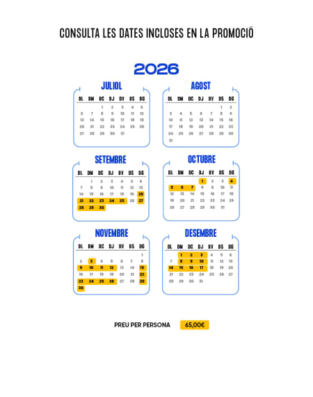 - Desembre: 01; 02; 03; 08; 09; 10; 14; 15; 16; 17. - El preu de 65 € està limitat a un màxim de 30 habitacions per data de validesa per a reserves realitzades fins al 31/12/2026.