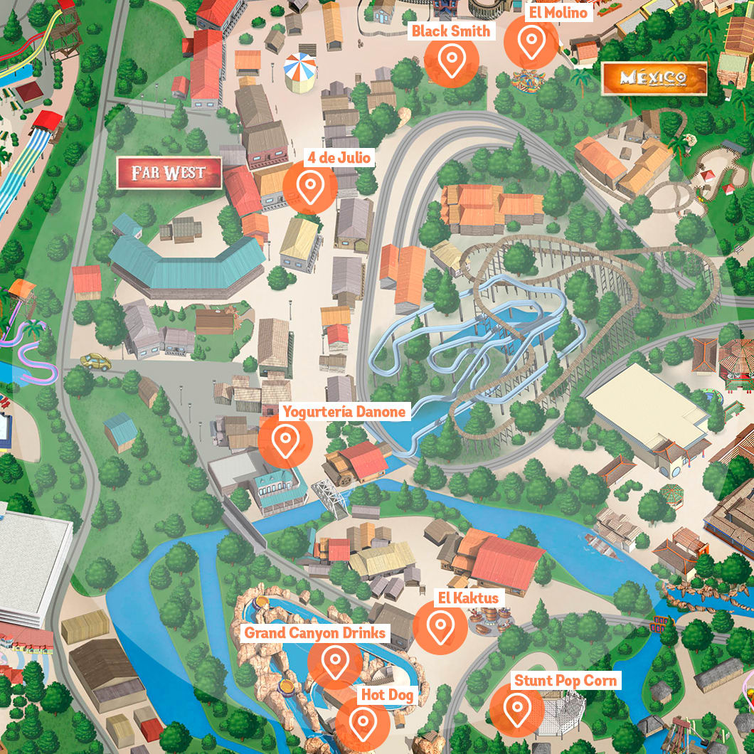 Cowboys and cowgirls are tough people, but they also need to look after themselves and take a break. Thanks to the Far West food outlets, you can follow their lead. In Long Branch Saloon you will find delicious tapas, beers, and soft drinks. Book here! At Hot Dog you have hot sandwiches and soft drinks. At Sweet House you will find the best recipes with Nutella and Ferrero chocolates. At Spirello delicious fried spiral-cut fried potatoes to double your pleasure. Black Smith serves sandwiches, snacks, and soft drinks. At Stunt Pop Corn you will find popcorn, chocolates, crepes, waffles, soft drinks, and slushies. At El Búfalo there's fresh fruit, milkshakes, ice creams, and waffles. Enjoy soft drinks and snacks at El Kaktus, and soft drinks and ice creams at El Molino. If you fancy something chilled and very special, enjoy the frozen yogurts at Loggers, You By Danone, the slushies at Grand Canyon Drinks, or the most famous ice creams in Ben & Jerry's. But don't forget to shout... yeehaw!