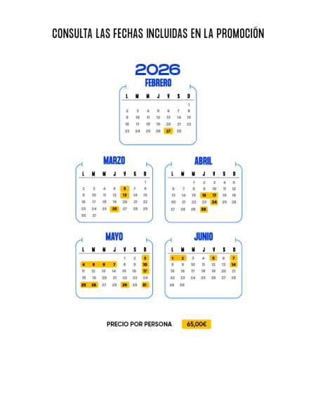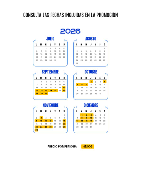 - Diciembre: 01; 02; 03; 08; 09; 10; 14; 15; 16; 17. - El precio de 65€ está limitado a un máximo de 30 habitaciones por fecha de validez para reservas realizadas hasta el 31/12/2026.